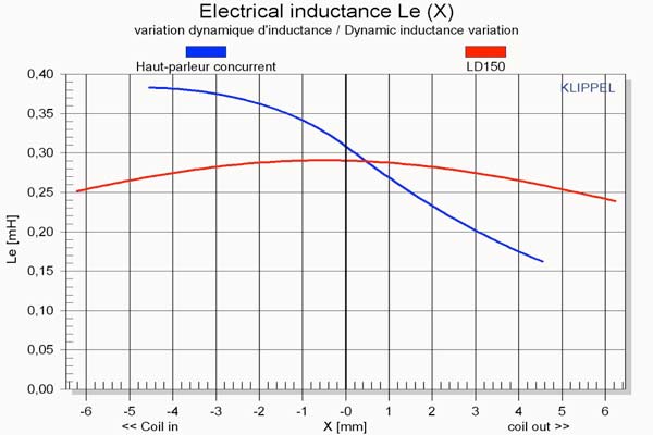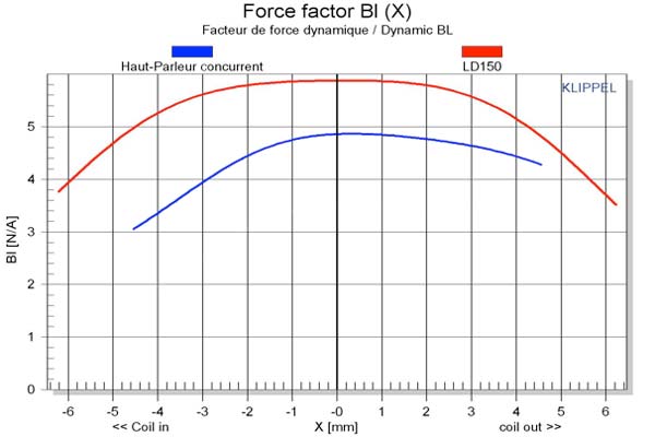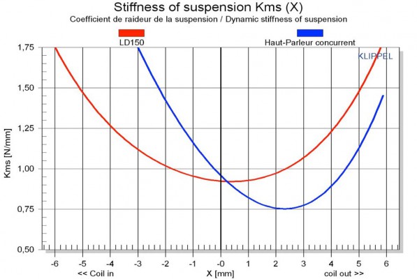 THE BLUE CURVE REPRESENTS THE MEASUREMENTS TAKEN FROM A COMPETITOR’S LOUDSPEAKER. YOU MAY NOTICE THAT THE ASYMMETRIC COEFFICIENT IS VERY HIGH… THE MINIMAL STIFFNESS POINT IS SITUATED AT ABOUT +2MM FROM THE REST POSITION. DURING ITS EXCURSIONS, THE DIAPHRAGM THEREFORE TENDS “TO GO BACK TO” THIS MINIMAL POINT INSTEAD OF OSCILLATING FREELY AROUND THE POSITION 0. THE RED CURVE REPRESENTS THE MEASUREMENTS FOR THE LD150. IT IS ALMOST SYMMETRICAL IN TERMS OF THE STIFFNESS COEFFICIENT, REPRESENTING BETTER MECHANICAL POWER HANDLING, IMPROVED DYNAMIC CAPACITIES AND REDUCED DISTORTION.