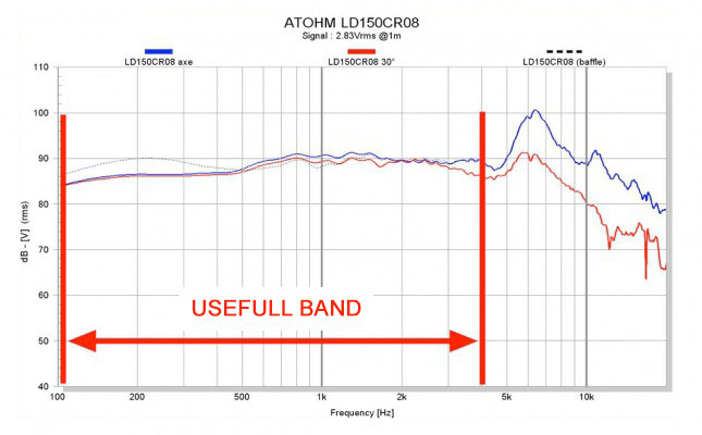 A great amount of studies done by our partner Atohm’s research and development team directed by Thierry COMTE led them to understand that the properties of the diaphragm material do indeed have a great influence on frequency response. However, the overall result is very closely affected by factors such as the rigidity and length of the coil former, the mass of the winding, the nature and quantity of adhesive used for the former/diaphragm seal, as well as the geometry, mass and viscoelastic properties of the peripheral suspension. Perfect “piston” movement by the diaphragm only exists for a limited frequency range. The directivity of a perfect piston always remains proportional to the dimensions of its emissive surface (and not its rigidity).